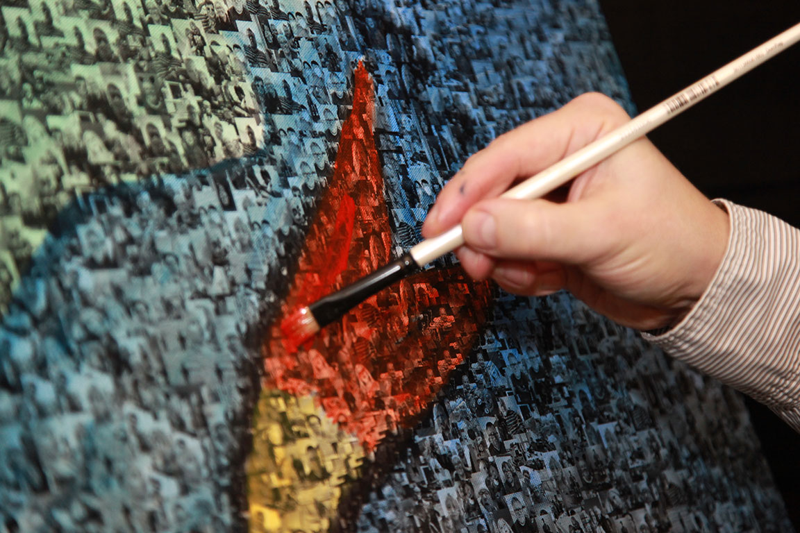 Vereint in einem Bild - eine echte Fusion. Egal ob 30 oder 10.000 Mitarbeiter, mit einem ausgeklügelten Algorhythmus verschmelzen alle zu einem gemeinsamen individuellen Motiv auf der Leinwand, das erst durch die Colorierung von Künstlerhand zu einem echten Hingucker und einer bleibenden Erinnerung wird. Begleitet von einem Kamerateam entsteht neben dem Gemälde auch ein emotionales Making-of, das schon bei der nächsten Video-Konferenz gezeigt werden kann.