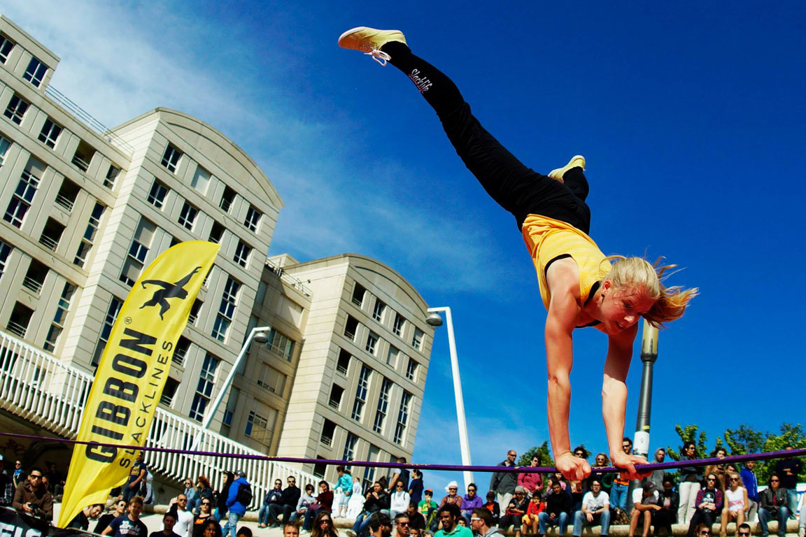 Das schmalste Trampolin der Welt: Elli beherrscht ihre 5 cm breite, elastische Slackline in Perfektion. Scheinbar losgelöst von jeglicher Schwerkraft präsentiert sie leichtfüßig, vermeintlich ohne Anstrengung spektakuläre Tricks auf weltklasse Niveau. Das Showkonzept wird auf Ihre Veranstaltung zugeschnitten und macht Ihr Promotion-Event, Firmenveranstaltung, Gala oder Messe zu einem unvergesslichen Event.